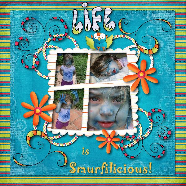 Here’s my speed scrap for tonight. There were a lot of embellishments & they couldn’t be touching and a lot of paper shape elements. Busy page for a busy little girl who had gotten into mommies paint while daddy was napping! Then she went back to bed & he woke up to find her blue!! Life is an adventure. The kit is My Funny City, font jokerman.
