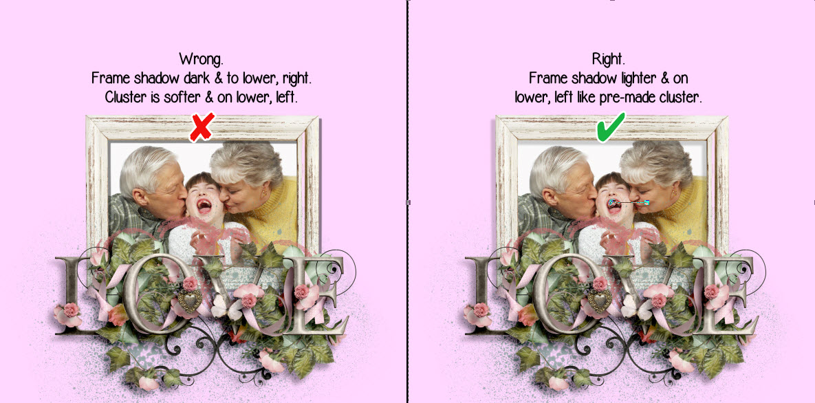 3. DO match the shadow direction for all elements on the layout. Tip: If you’re using a pre-made, pre-shadowed cluster try to match the shadowing on any other elements you add. In the photos below I used a pre-made pre-shadowed cluster. Most people tend to shadow to the right & below but the cluster was pre-shadowed to the left & below. The shadow for the frame looks much better on the right example. The frame shadow is slightly darker because it is closer to the page than the cluster.