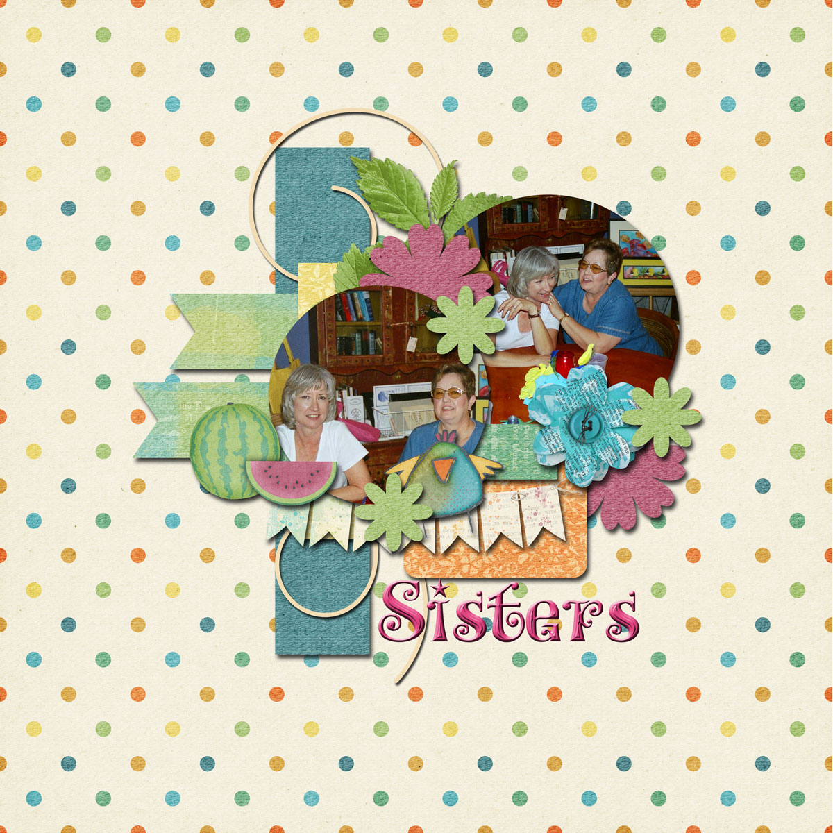 Today we celebrate three funny holidays-Friendship Day, Sister’s Day & Watermelon Day. I love them all! My love my Sister who is also my best friend. Although, I don’t have any photos of us eating watermelon together, I did include a watermelon in the layout.