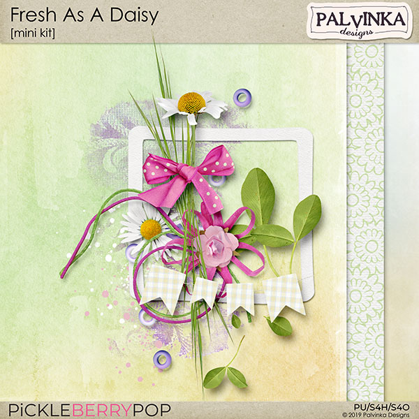 The Use It All Challenge at Pickleberrypop is always fun! Just create a layout using everything in the free mini kit then post it in the gallery and on the challenge page. Paula of Palvinka Designs is hosting this month. She has provided this sweet mini called Fresh as a Daisy.